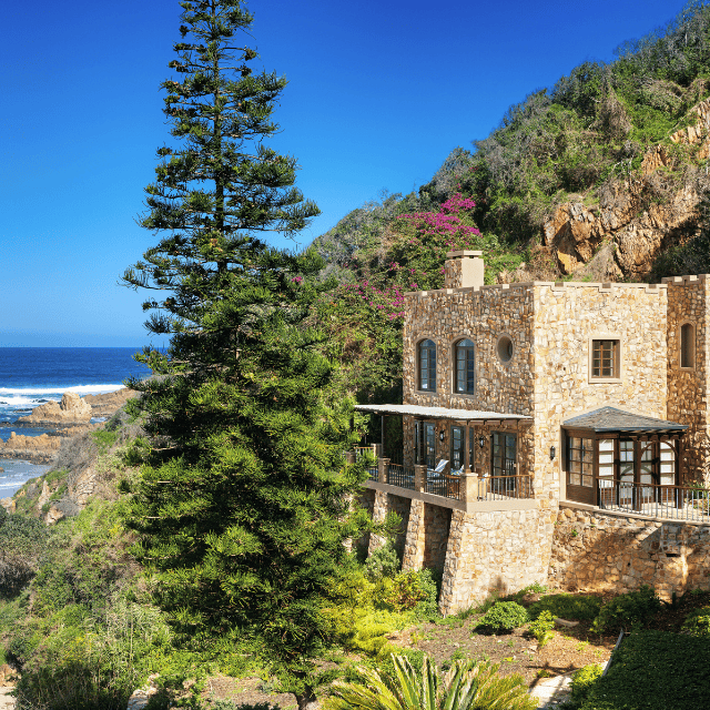 Built nearly a century ago into a forested cove, Craighross Castle offers a rare kind of escape along the Garden Route. This remote seaside villa is just steps away from Noetzie beach, making it an ideal retreat for group travel. Alfresco dining areas and expansive terraces provide the perfect setting to relax, entertain, and take in breathtaking ocean views.